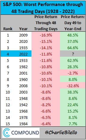 De financiële markten hebben het dit jaar zwaar. Diverse gebeurtenissen, zoals de oorlog in Oekraïne, problemen in de toeleveringsketen en oplopende inflatie, hebben gezorgd voor een negatief rendement Year to Date. Kijkend naar de historie vanaf 1928 zegt dit nog niets over de uiteindelijke resultaten aan het einde van het jaar. De onderstaande afbeelding laat de periodes zien waarin de S&P 500 de slechtste resultaten had in de eerste 48 dagen van het jaar en de uiteindelijke resultaten op het einde van het jaar. Daaruit blijkt dat er slechts in twee jaar van de vijftien jaren na een slechte start van het jaar ook een negatief eindresultaat behaald is.